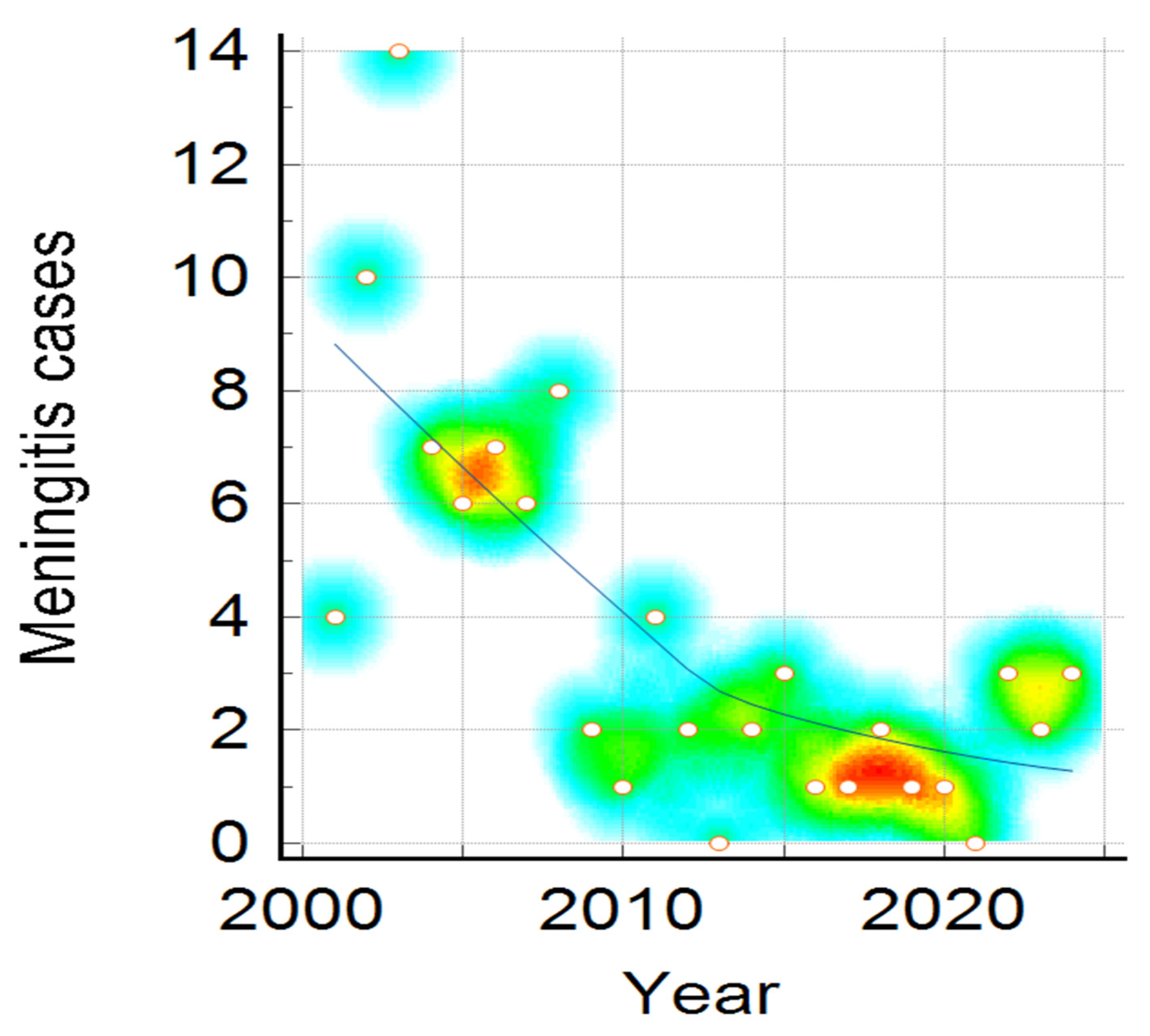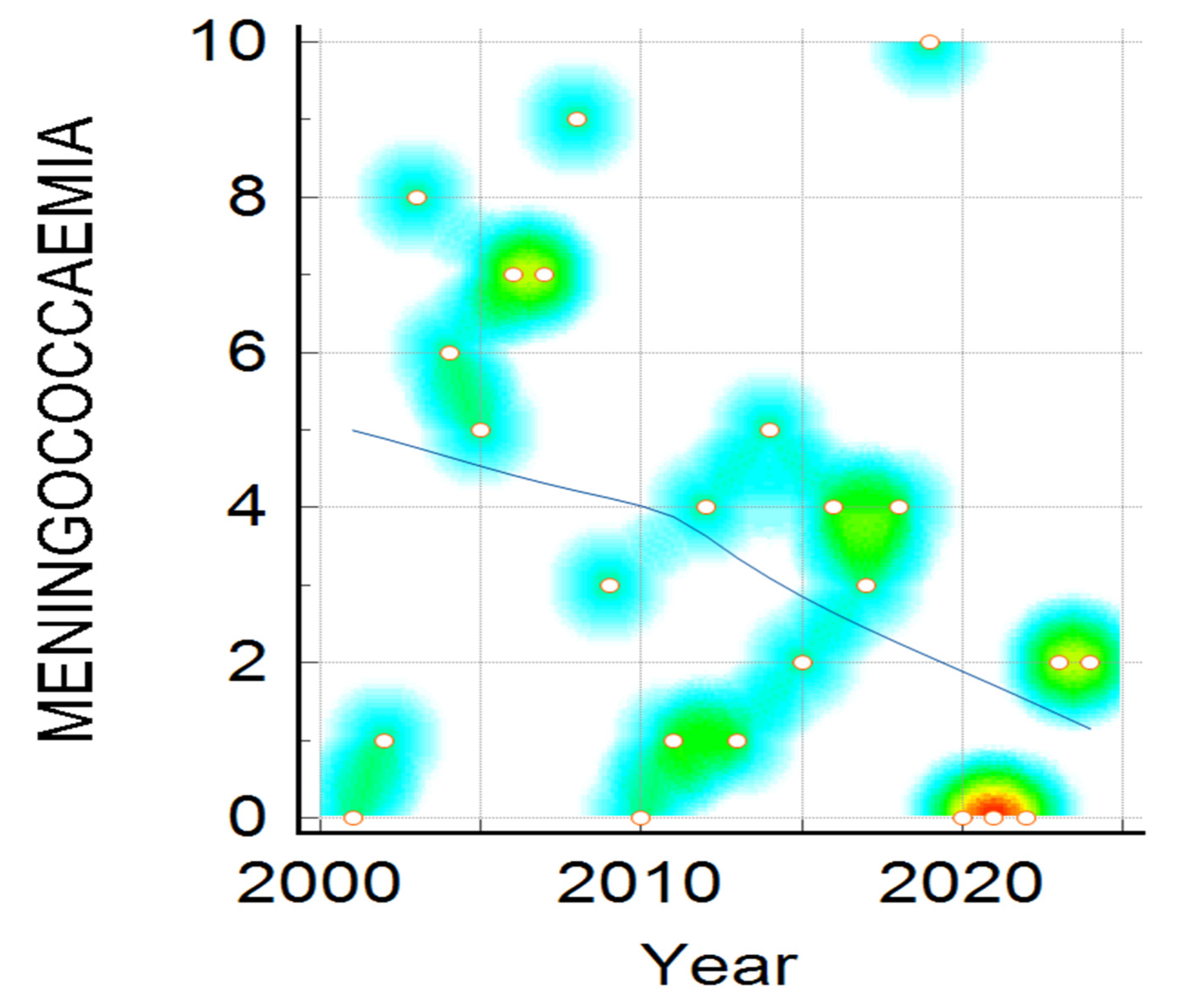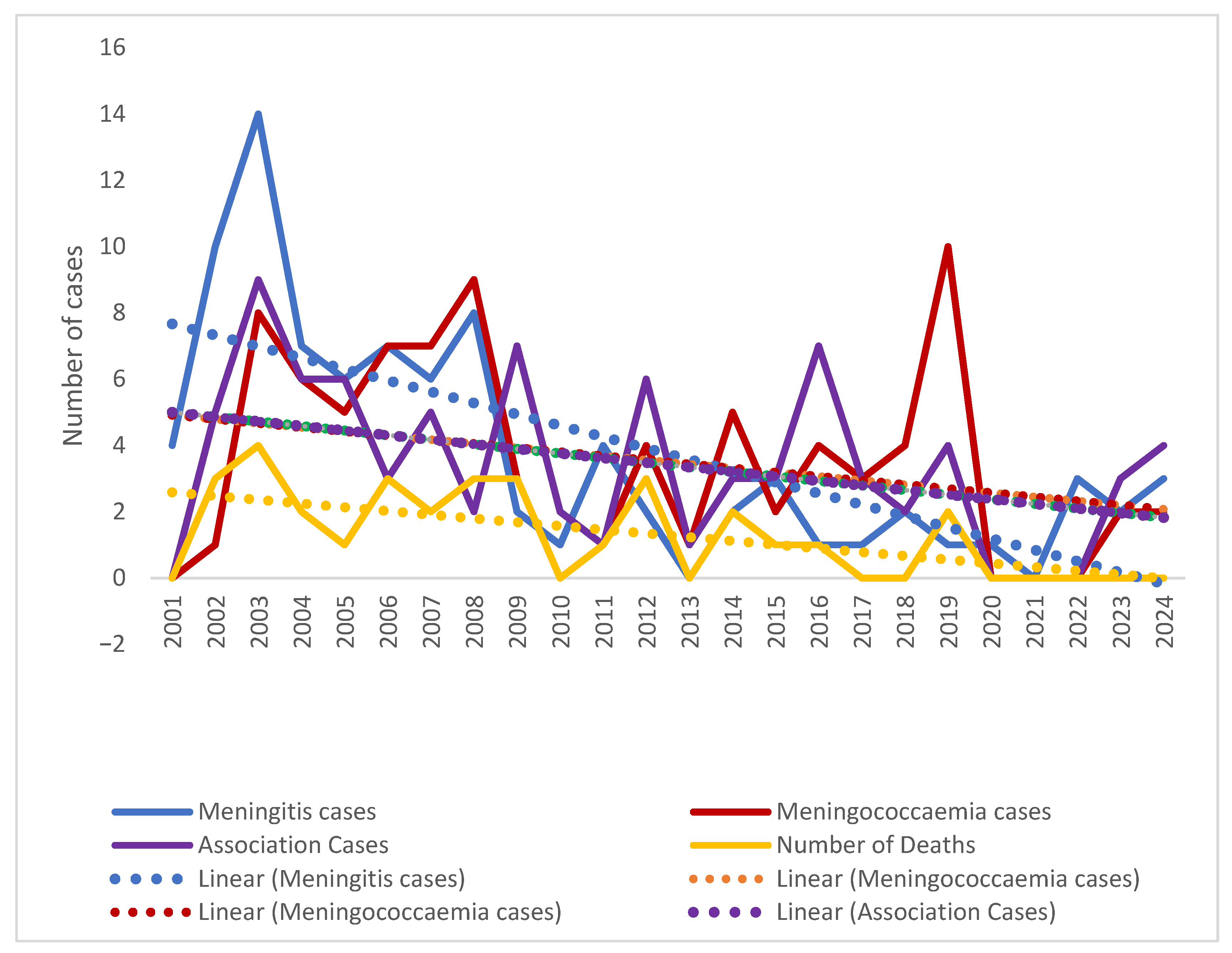 Association of meningitis and meningococcaemia showed a similar decreasing number of cases in the 24-year period, with more cases in 2003–2005, 2012, 2019 and 2024, but in general with a descending trend, similarly to the previously presented trends of meningitis alone and meningococcaemia alone (