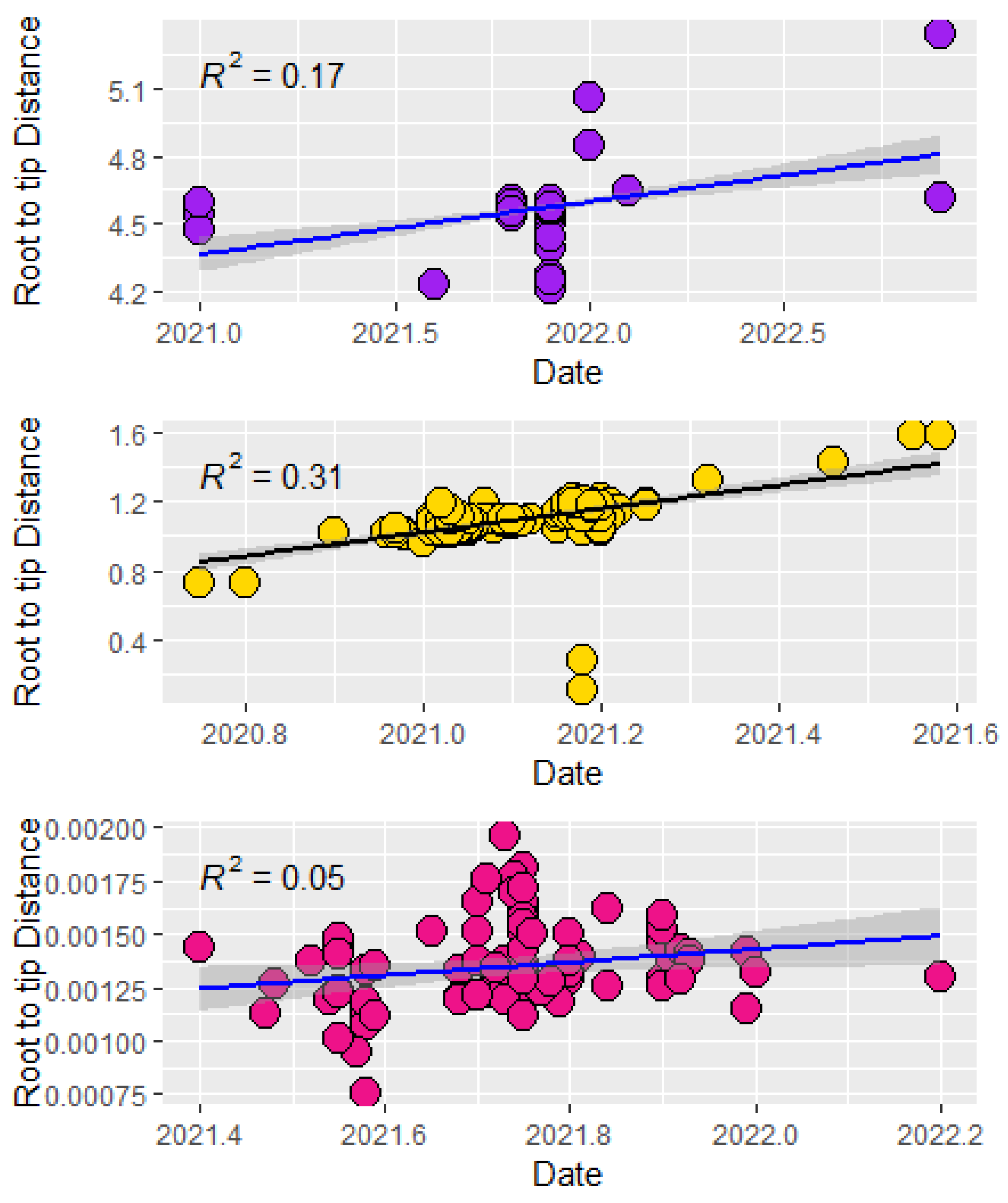 - Rambaut, A.; Lam, T.T.; Max Carvalho, L.; Pybus, O.G. Exploring the temporal structure of heterochronous sequences using TempEst (formerly Path-O-Gen). Virus Evol. 2016, 2, vew007. [Google Scholar] [CrossRef]