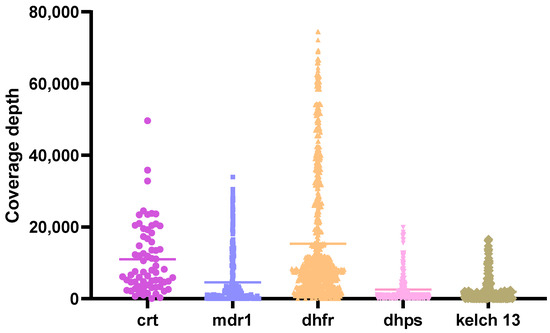 Coverage depth of targeted genes. Multiplex PCR was performed to amplify crt, mdr1, dhfr and dhps genes, while kelch13 was amplified separately. The resulting PCR products were pooled and visualized on a 1.5% agarose gel electrophoresis. Purified amplicons were then used for library preparation using the Oxford Nanopore Technologies (ONT) Native Barcoding Kit 24 V14 (SQK-NBD114.24). The final library was loaded onto a Flongle flow cell (R10.4) and sequenced for over 20 h. Raw FASTQ files generated from the run were processed to produce variant call format (VCF) files. Variant coverage depths were evaluated, with a minimum threshold set at 20×.