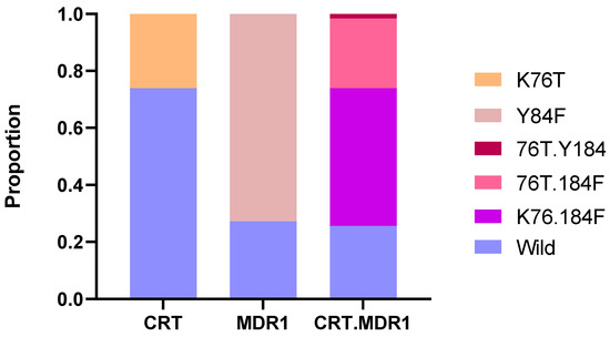 Distribution of Plasmodium falciparum SNPs in CRT and MDR1 across the sequenced samples. The stacked bar chart shows the proportion of wild-type and mutant alleles for the CRT and MDR1 genes individually, as well as for combined CRT + MDR1 haplotypes.
