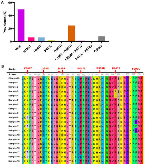 Overall SNP and haplotypes identified in the kelch13 gene. (A) Histogram presenting the proportions of Kelch13 SNP and haplotypes. (B) Multiple sequence alignment of 19 kelch13 sequences generated from Sanger sequencing data.