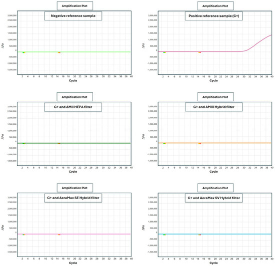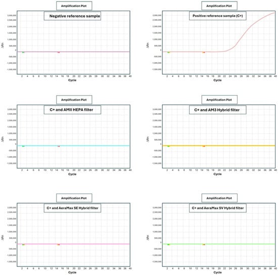The same sample, after processing by sanitizers equipped with either HEPA or Hybrid filter, underwent full negativization, with no signal being detectable even after 40 qPCR amplification cycles (>40th cycle, undetected).
