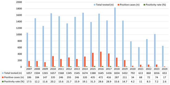 A modest resurgence was observed in 2022 and 2023, with 72 and 74 cases, respectively, but the numbers remained lower than pre-pandemic levels. In 2024, only 17 cases were identified. However, this decline occurred alongside a marked reduction in specimen numbers, indicating that the observed trend may reflect both reduced viral circulation and decreased number of tests (Figure 1).