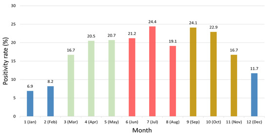 Monthly analysis of HRV positivity rates revealed significant variation (χ2 = 517.41, df = 11, p < 0.001; Table 2). The lowest positivity rate was observed in January (6.9%), with similarly low levels in February (8.2%). From March (16.7%) to June (21.2%), a gradual increase was noted. The highest positivity rate was recorded in July (24.4%), while high levels were also observed in September (24.1%) and October (22.9%). In contrast, the rate declined to 16.7% in November and further to 11.7% in December (Figure 2).