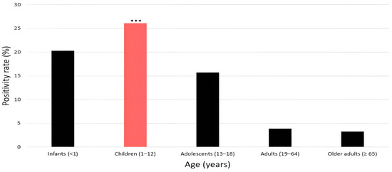 Age-specific positivity rates of human rhinovirus (HRV). Bars represent HRV positivity rates (%) by age group, showing the highest rate in children (red bar) (26.1%), followed by infants (20.3%) and adolescents (15.7%), while adults (3.9%) and older adults (3.3%) exhibited markedly lower rates; significance is indicated as *** p < 0.001.