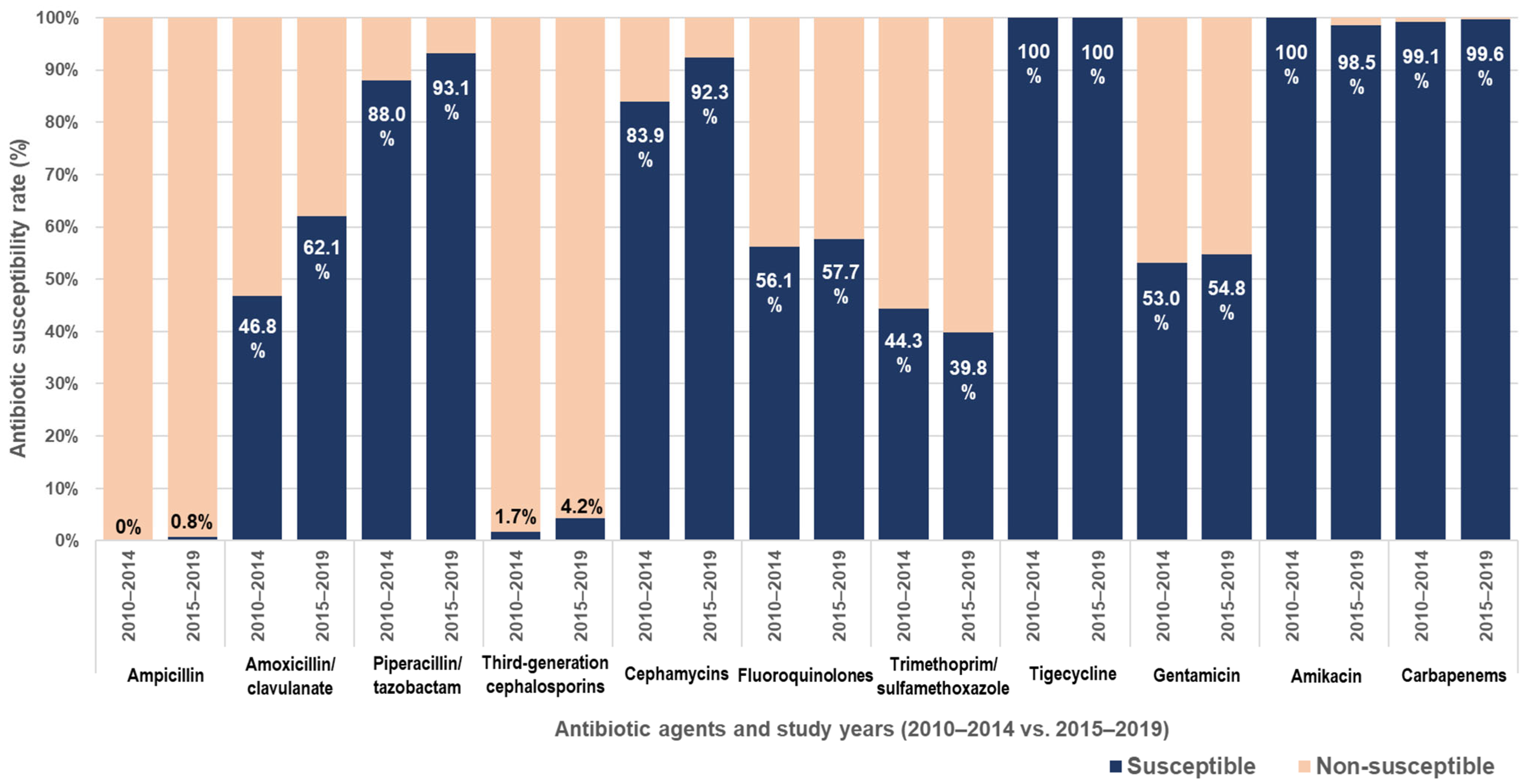 - Clinical and Laboratory Standards Institute (CLSI). Performance Standard for Antimicrobial Susceptibility Testing, 20th ed.; CLSI supplement M100; Clinical and Laboratory Standards Institute: Wayne, PA, USA, 2010. [Google Scholar]