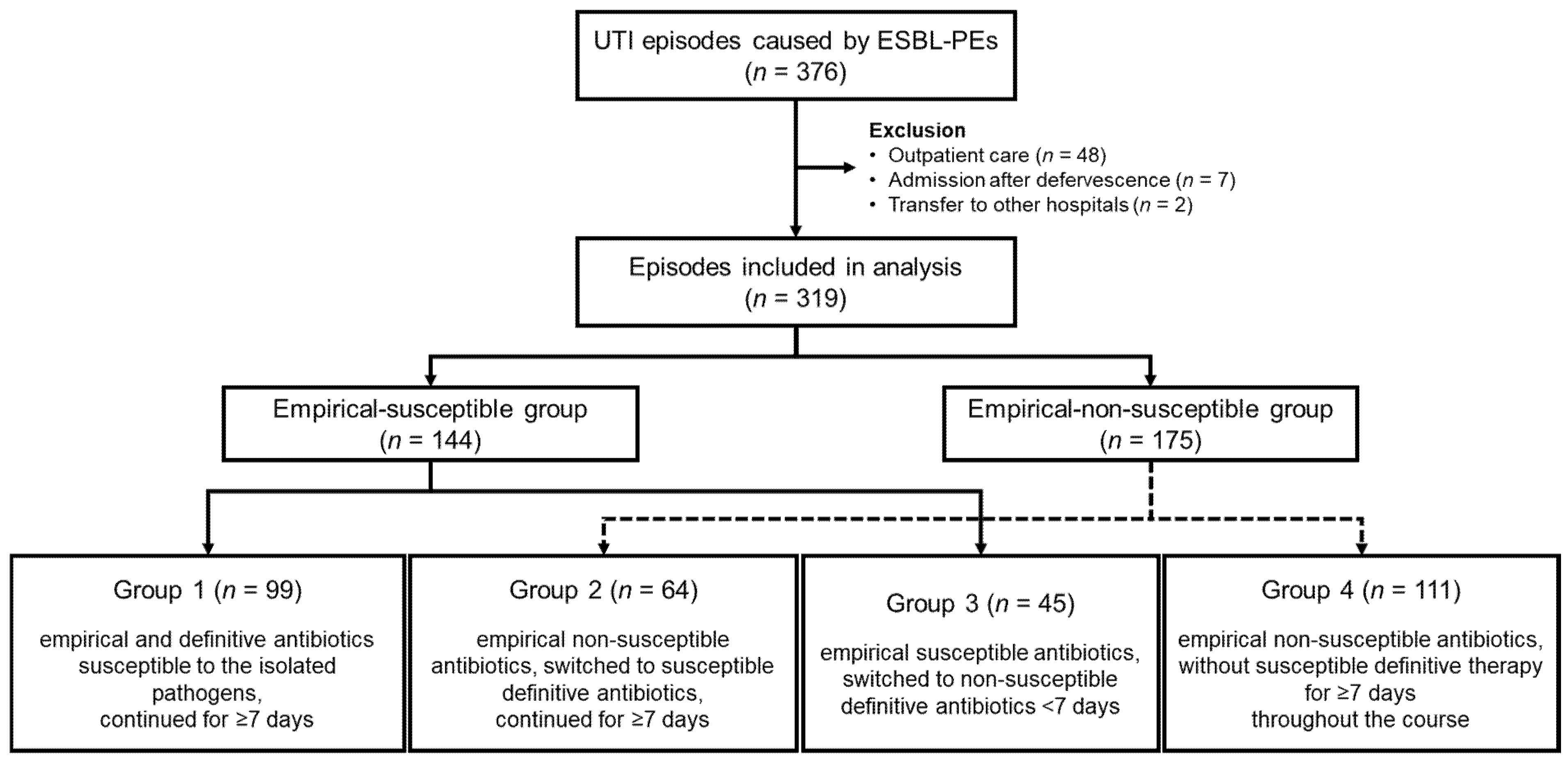 - Group 4: Empirical therapy started with non-susceptible antibiotics, and susceptible antibiotics were not administered for ≥7 days during the entire treatment course, regardless of the definitive regimen.