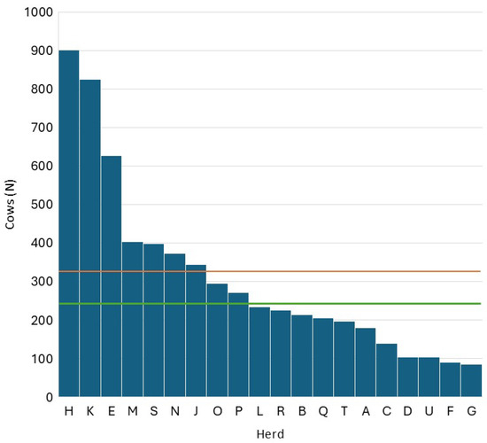 Figure 1 reports the distribution of herd sizes in the 20 herds considered. The mean herd size was 310 cows/herd, which is higher than the Lombardy average at the end of 2024 (108 lactating cows/herd). The difference between the two means is due to the characteristics of the herds enrolled in ARAL, which include most of the largest and most efficient herds in the region.