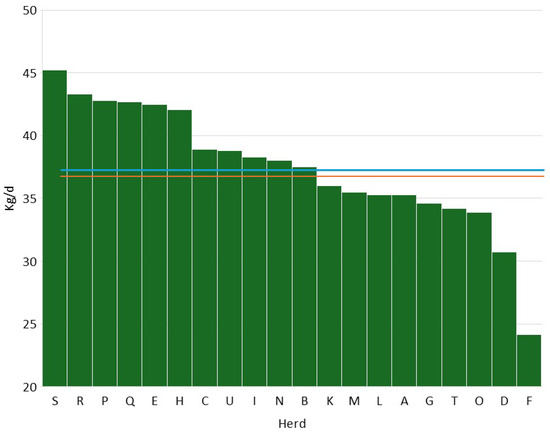Distribution of average daily production in the 20 herds considered in Lombardy (the red line represents the mean, and the green line represents the median).