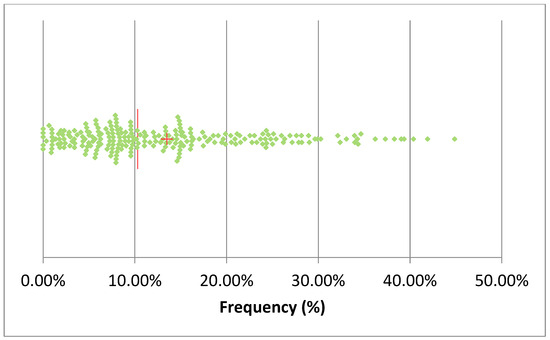 The distribution of the frequency of cows with PLCC < 5000 cells/mL is shown in Figure 6. The median of the distribution is 4.2%; therefore, 50% of the herds had higher frequency of cows below the threshold, and 25% of them had a frequency ≥8.6%.