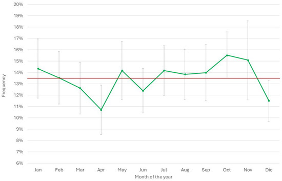 Table 2 summarizes the total number of AMT in 2024 and the proportion of mastitis treatments among them. The total AMT varied between 17 (herd U) and 2695 (herd K), while mastitis antimicrobial treatment (MAT) frequency during lactation varied between 4% (herd K) and 96% (herd R) of the total AMT. The median of mastitis antimicrobial treatments was 55%, while in 25% of the herds, the MAT frequency was below 35% of the total AMT. The monthly median of the frequency of AMT per cow in the herd (AMT/CH) was 10.3% (Figure 3), and in 50% of the herds, AMT/CH frequency was in the range of 12–70%. The mean was, obviously, higher (13.5%), and the first quartile was 6%, while the third was 18.8%, suggesting that the overall frequency of AMT/CH was relatively low on a monthly basis. This observation was confirmed by the distribution of treatments by month of the year, ranging between 10% and 16% (Figure 4), with lower values in April and December, while higher values were observed in October and November.