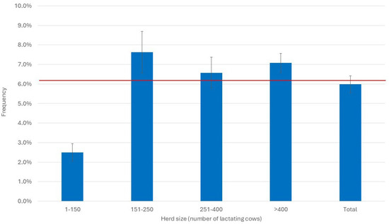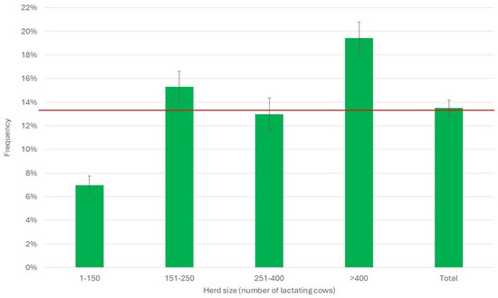 Herd size also affected the frequency of cows below the PLCC threshold. Indeed, the smaller herds had a mean below 2.5%, while in the larger herds, the means were close and within the range of 6.6–7.6% (Figure 8).