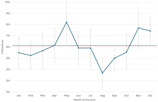 Distribution of the monthly mean (±std. err.) frequency of treatments in the 20 herds considered by month of the year 2024. The red line represents the overall mean of the year.