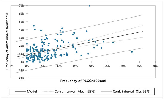 Linear regression model calculated for the frequency of cows with a polymorphonuclear neutrophil leukocyte cell count (PLCC) of < 5000/mL and the frequency of antimicrobial treatments per cow in the herd.