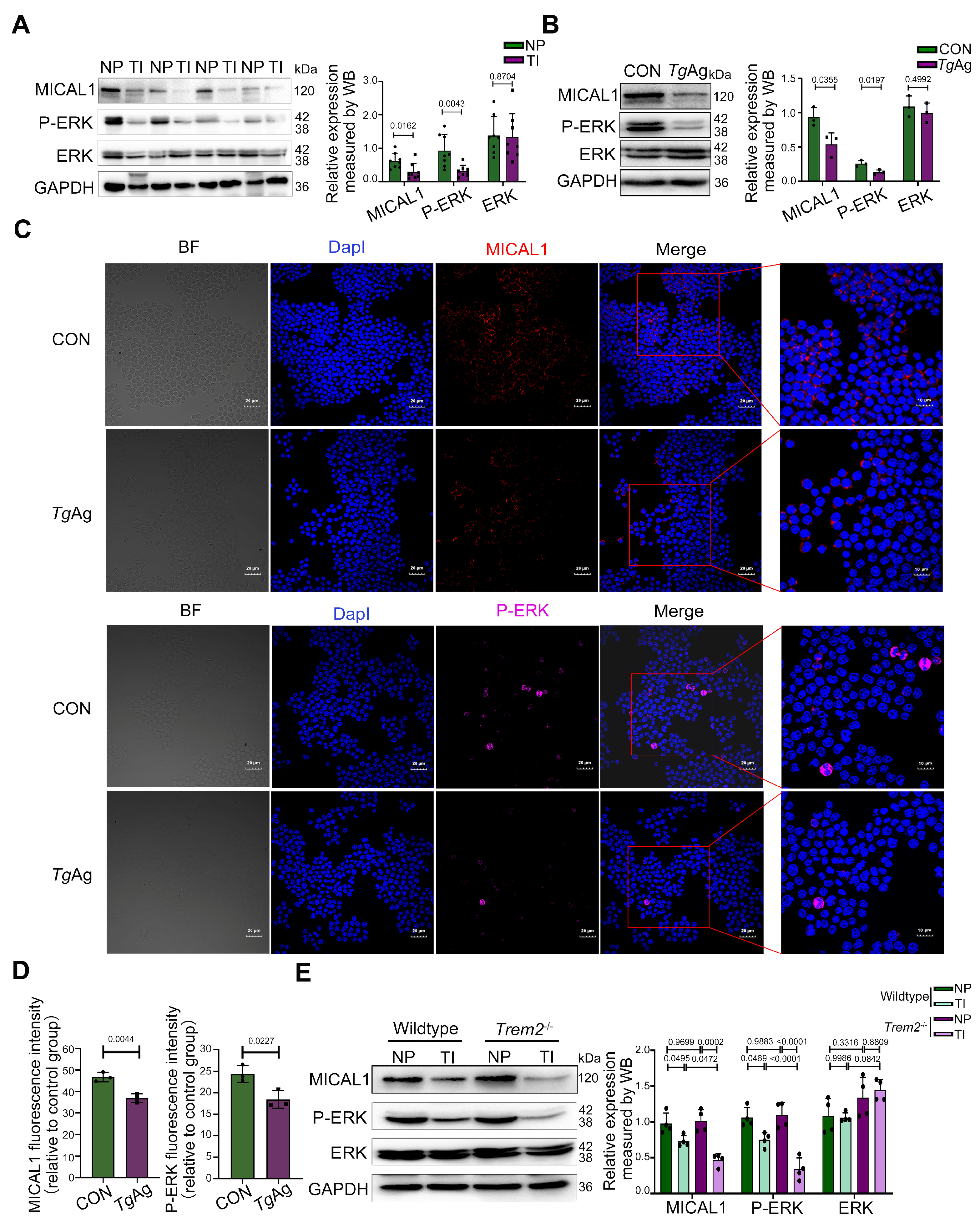 APA StyleGeng, X., Yang, H., Wang, Z., Chen, Z., Chen, J., & Yang, M. (2025). Trem2-MICAL1-P-ERK Axis in Macrophages Confers Protection Against Toxoplasma gondii-Induced Adverse Pregnancy Outcomes. Pathogens, 14(11), 1105. https://doi.org/10.3390/pathogens14111105