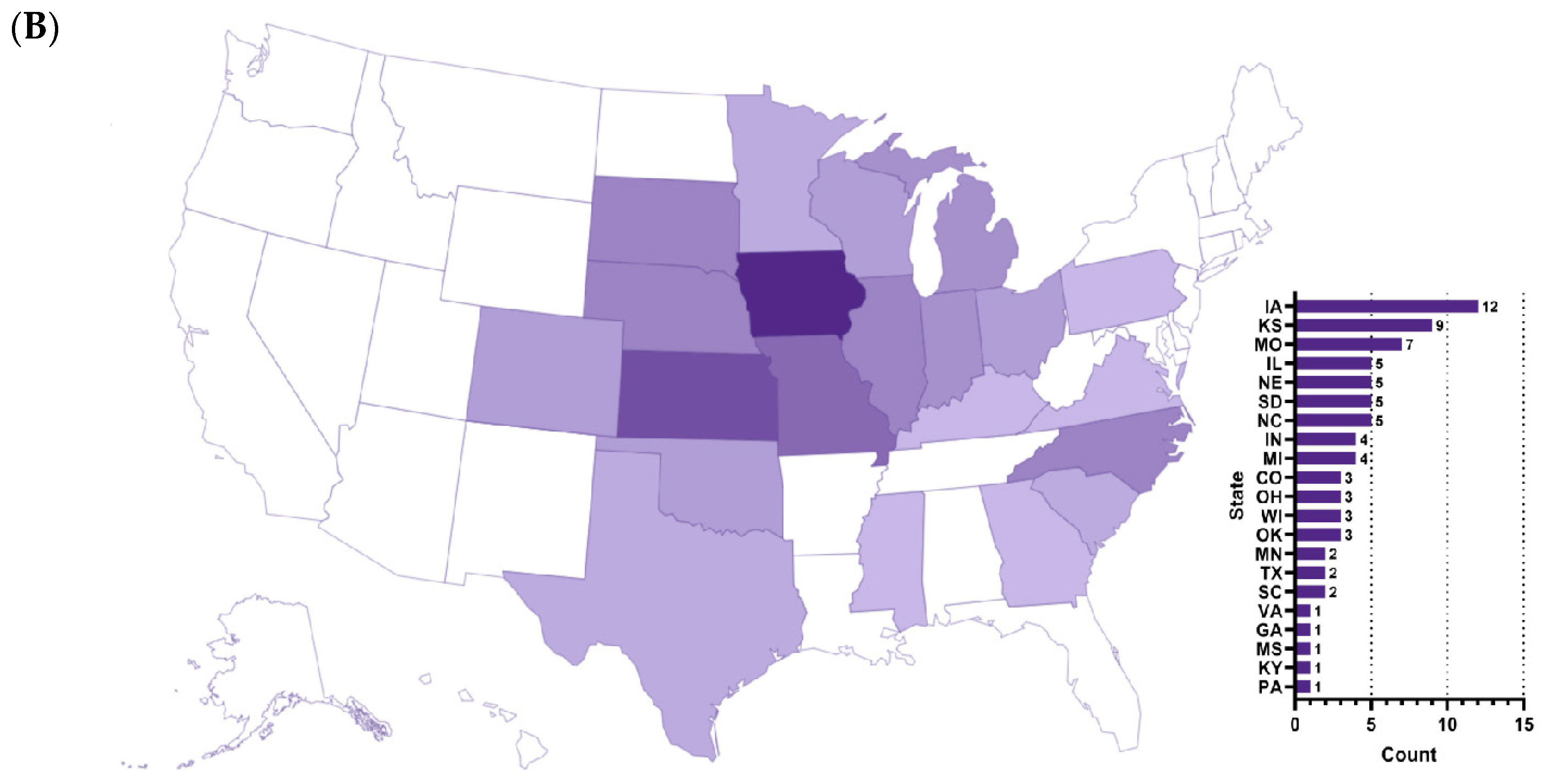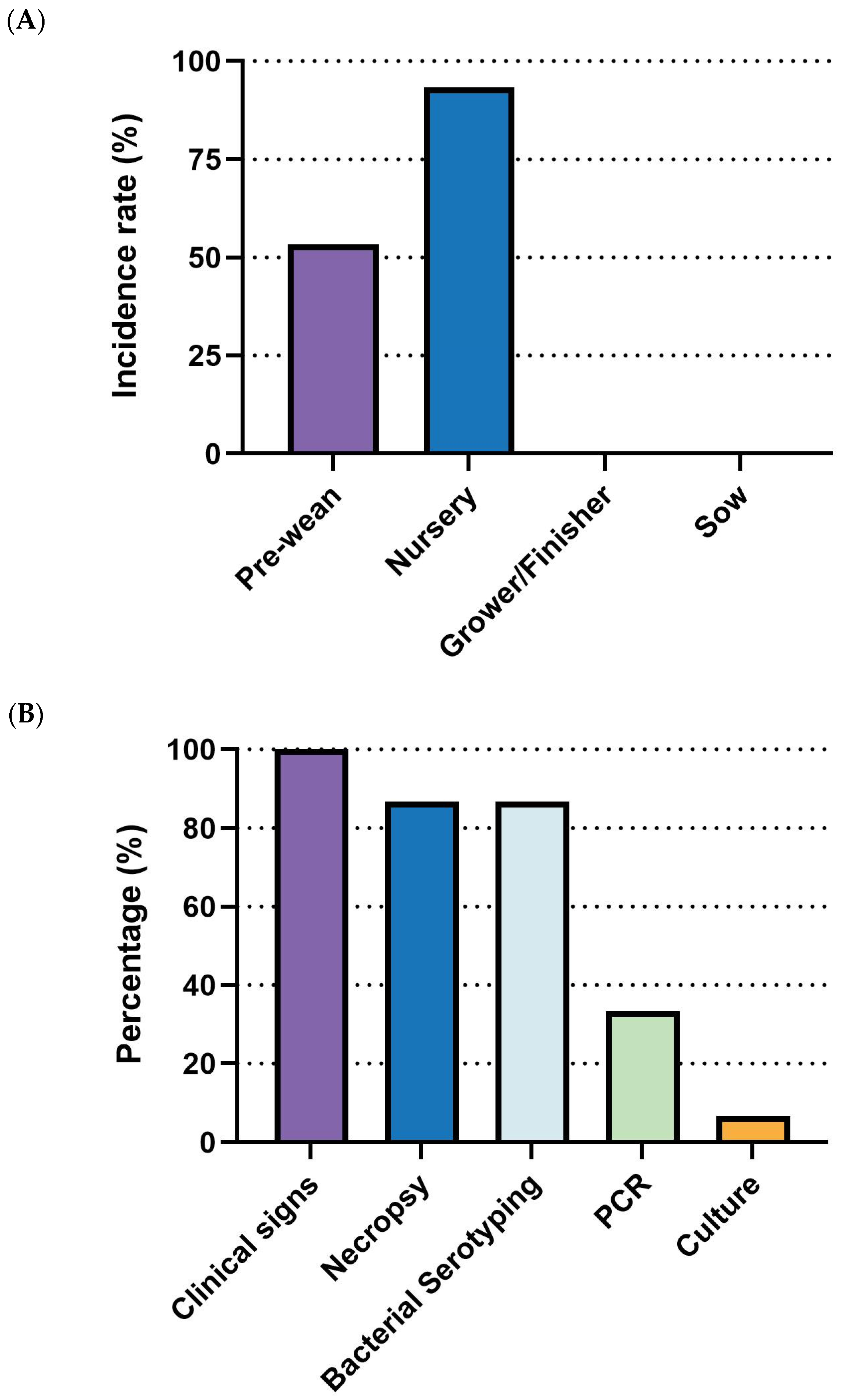 Figure 4A). Diagnostic efforts largely rely on clinical signs and necropsy (92.8%, 13/14) and bacterial serotyping (85.7%, 12/14). Less frequent methods include PCR (35.7%, 5/14), culture, immunohistochemistry (IHC), and histopathology (without IHC) (