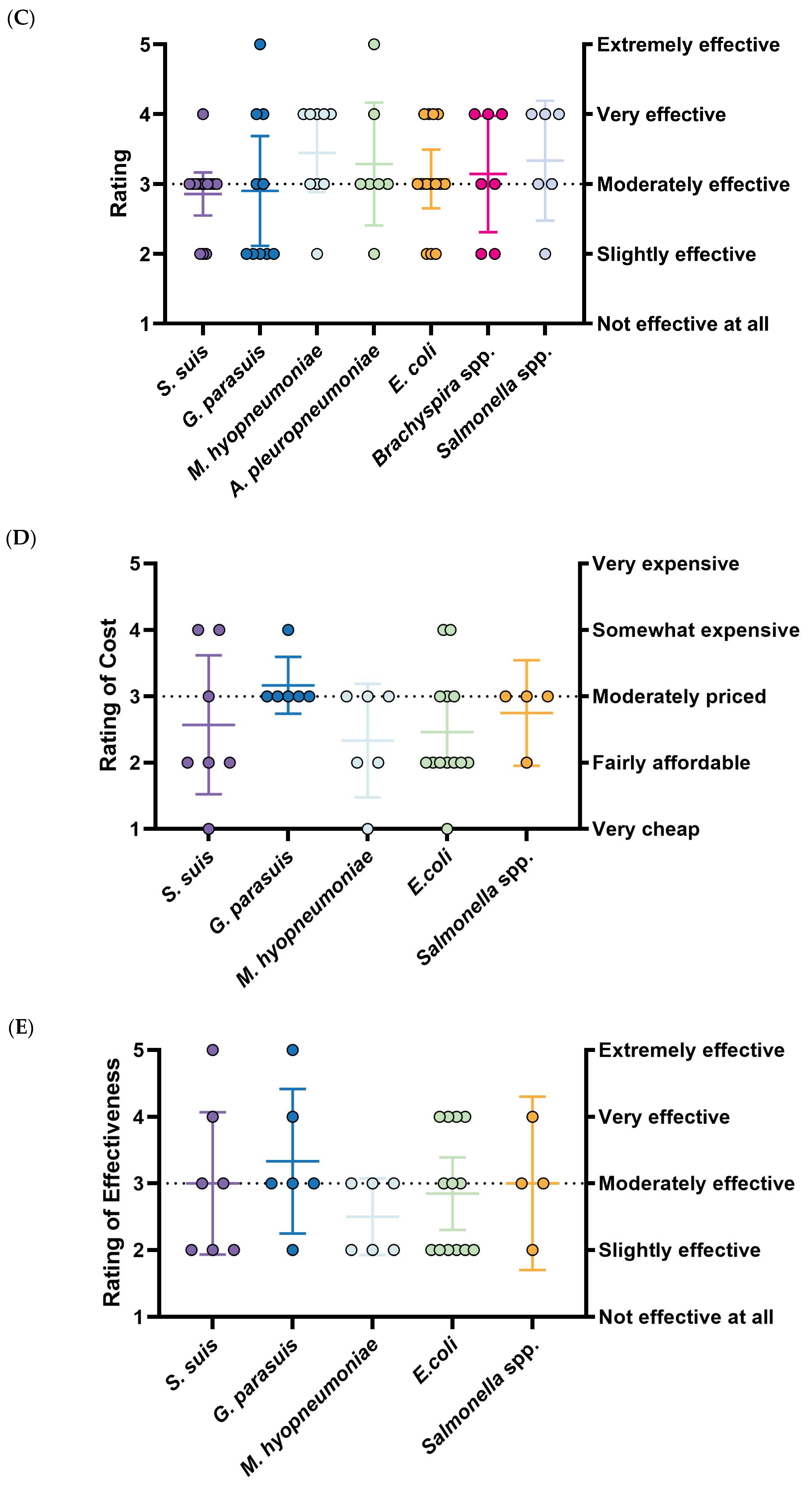 M. hyo vaccines are quite distinct: they are exclusively commercial (66.6%, 6/9) and received the highest ratings for existing control measures (3.44, 95%CI: 2.89–4.00). While these vaccines are the cheapest (2.33, 95%CI: 1.48–3.19) and most accessible (4.67, 95%CI: 4.13–5.20), they are simultaneously rated as the least effective (2.50, 95%CI: 1.93–3.08) (