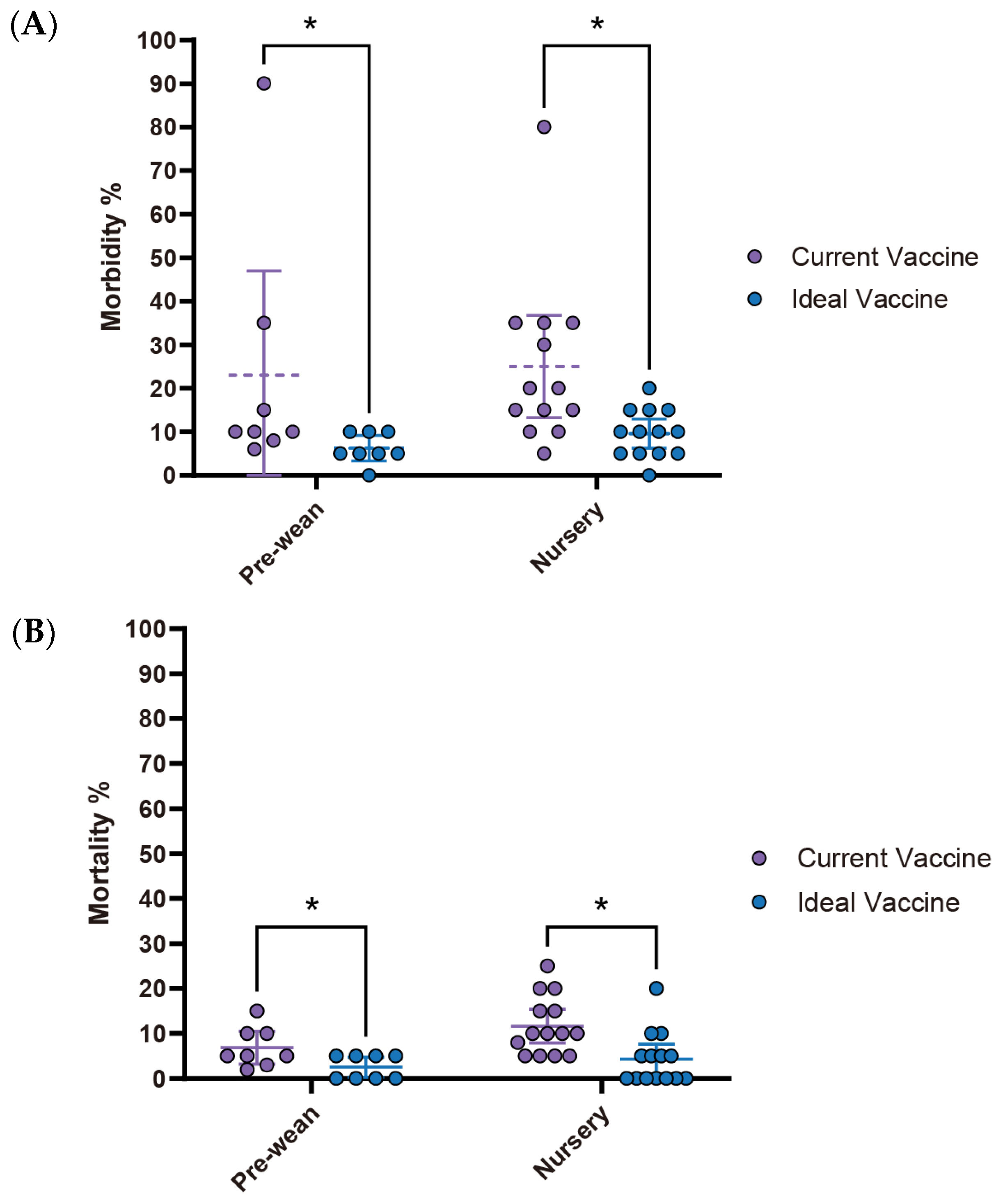 S. suis vaccine fails to meet veterinarians’ expectations, particularly concerning morbidity and mortality rates in the nursery stage. While no statistically significant differences are observed in the pre-wean stage, the nursery stage showed a significant reduction in morbidity from 13.9% (95% CI: 6.26–21.60) with current vaccines to 4.4% (95% CI: 2.14–6.75) with an ideal vaccine (