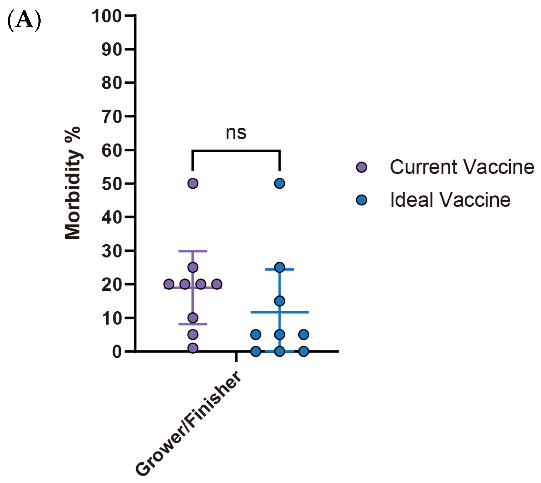 M. hyo vaccine improvements showed the lowest expectations among the four diseases analyzed. There were no significant differences (ns) observed in both morbidity and mortality rates between the current and ideal vaccines. Specifically, morbidity decreased from 19% (95% CI: 8.12–29.88) with the current vaccine to 11.7% (95% CI: −1.08–24.41) with the ideal vaccine, while mortality declined from 4.4% (95% CI: 2.14–6.75) to 2.2% (95% CI: 0.20–4.25), with neither showing statistical significance (