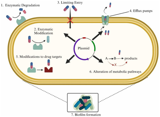 Antibiotic resistance is the ability of bacteria to withstand exposure to antibiotics to which they were previously susceptible [35]. Bacteria develop resistance through various mechanisms, including genetic, biochemical, or phenotypic adaptations that could either modify the target protein and reduce its interaction with antibiotics, or express proteins that degrade the antibiotics or pump them out of the cell before they reach therapeutic concentrations [36]. Additionally, bacteria can adopt alternative metabolic pathways to bypass the antibiotics’ action [37] or form biofilms to limit their penetration into cells, creating tolerant zones, and promoting genetic changes [38] that lead to the development of antibiotic resistance. Common mechanisms of antibiotic resistance development are summarized in Figure 1 [37]. With any of these events in place, existing bacteria adapt to adverse conditions, and the new strains growing inside the host develop mutations, making them resistant to the current antibiotic regimen. Inappropriate use of antibiotics can lead to the emergence of antibiotic-resistant strains in one patient, which can then spread to other patients who do not use antibiotics, underscoring the severity of this public health concern [38].