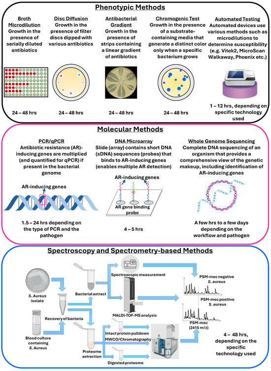The most commonly used methods for antibiotic resistance detection are based on phenotypic and molecular characterization, with newer techniques such as those that are based on spectroscopy and spectrometry (Figure 2) [45].