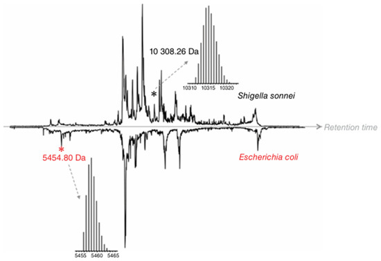 Comparison of the total-ion chromatograms obtained for the LC-MS analysis of intact proteins extracted from S. sonnei and E. coli lysates. Black and red asterisks indicate a unique protein peak for S. sonnei and E. coli, respectively [103]. © Wiley, reprinted with permission.