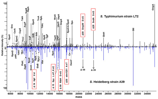 Comparison of intact protein expression profiles for S. Typhimurium strain LT2 and S. Heidelberg strain A39. A subset of identified proteins is labeled with protein names. Six highlighted masses contain serovar-specific SNP-related mass differences. Amino acid changes are noted from S. Typhimurium to S. Heidelberg [104]. © American Chemical Society, reprinted with permission.