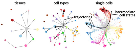 Partition-based graph abstraction (PAGA) for RNA-seq data for the flatworm, Schmidtea mediterranea, at tissue, cell type, and single-cell resolution [153]. Each color represents distinct cell clusters or groups based on transcriptional composition.