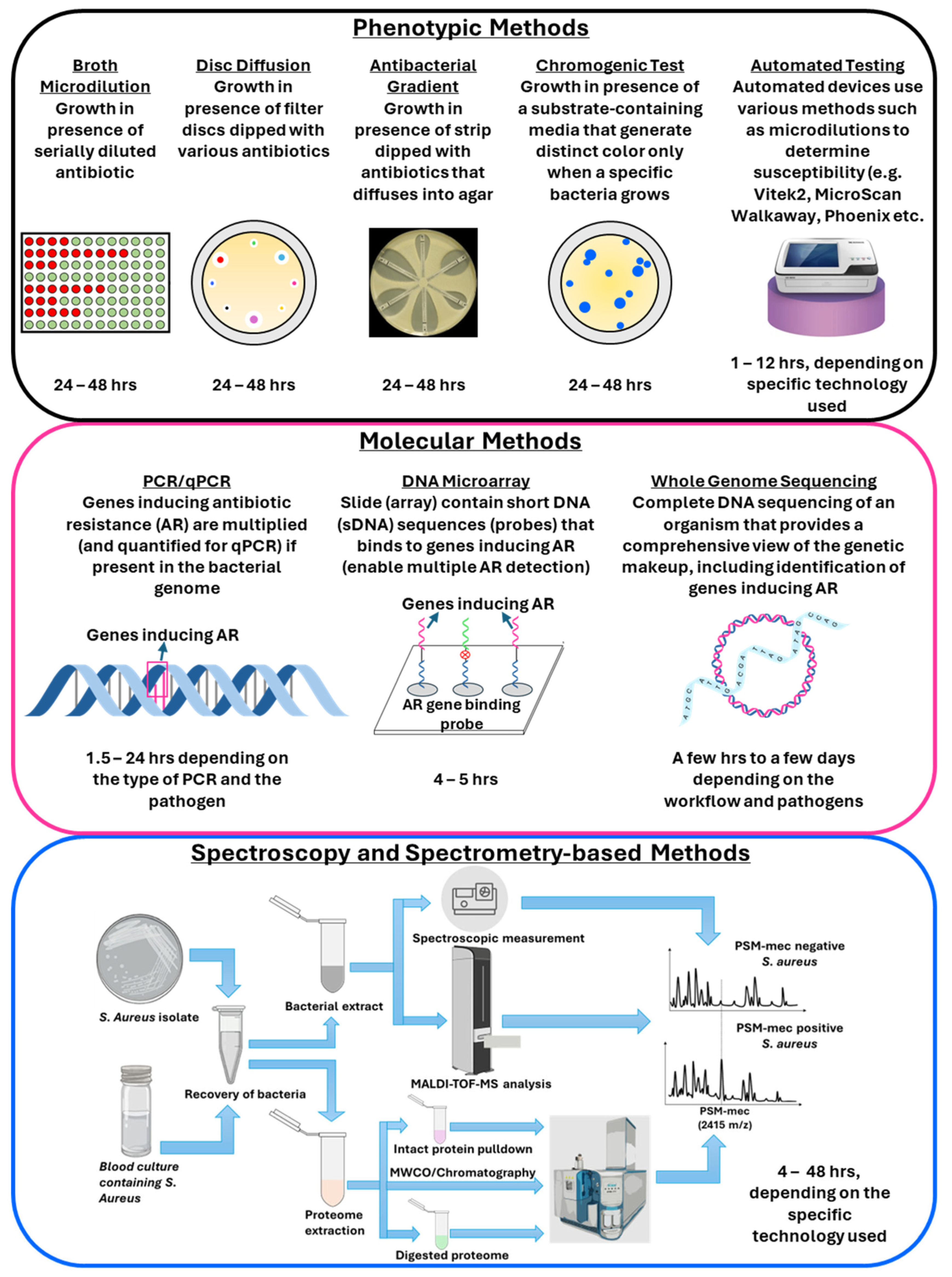 - Yamin, D.; Uskoković, V.; Wakil, A.M.; Goni, M.D.; Shamsuddin, S.H.; Mustafa, F.H.; Alfouzan, W.A.; Alissa, M.; Alshengeti, A.; Almaghrabi, R.H.; et al. Current and Future Technologies for the Detection of Antibiotic-Resistant Bacteria. Diagnostics 2023, 13, 3246. [Google Scholar] [CrossRef] [PubMed]