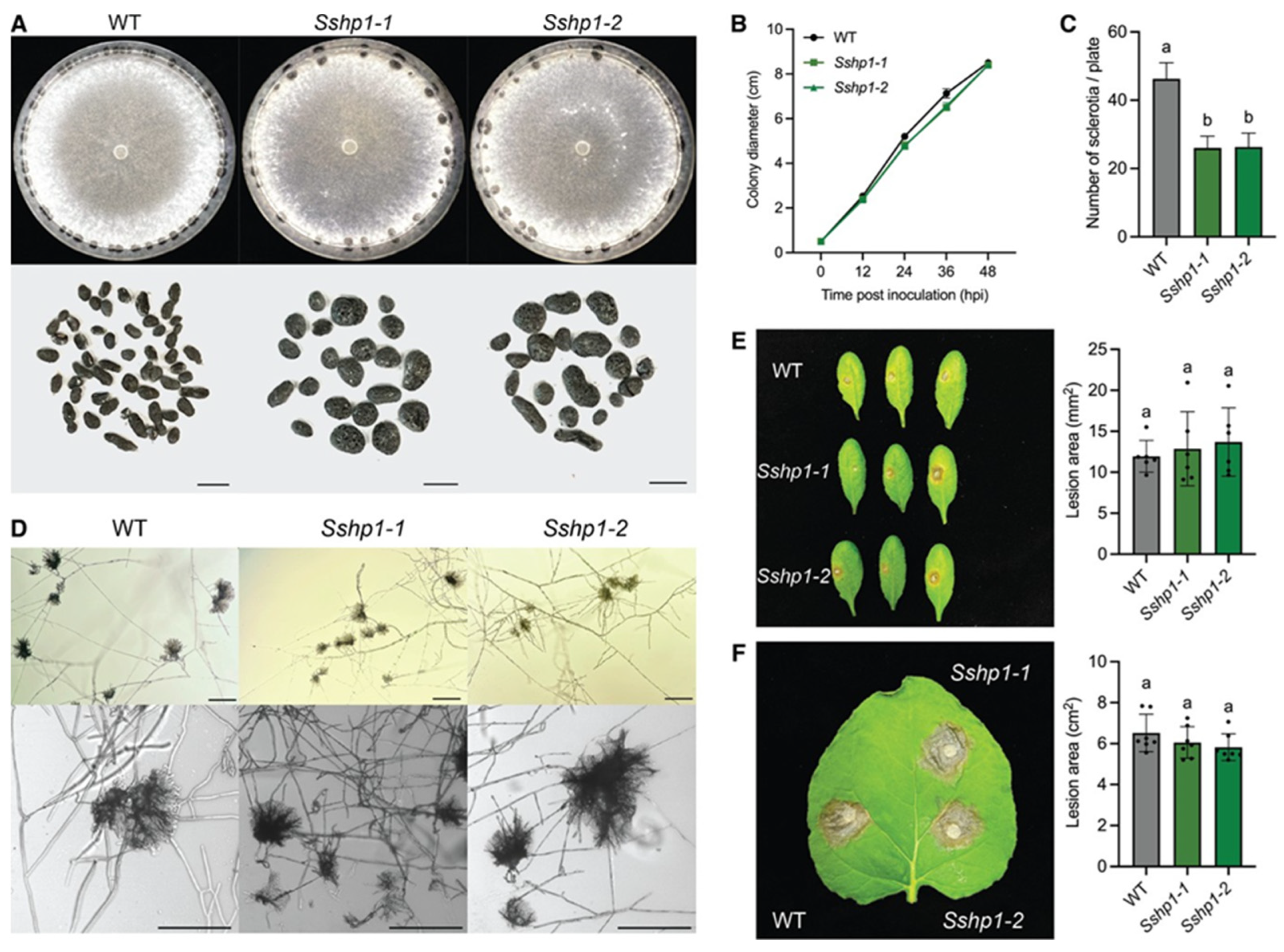 To evaluate growth rate and assess colony morphology, 5 mm mycelial agar disks were excised from the margins of 2-day-old WT and mutant colonies using a sterile pipette tip and placed at the center of fresh 85 mm PDA plates, which were then incubated at room temperature. For each genotype, three biological replicates were performed. Colony diameter was measured every 12 h until the plates were fully colonized. Colony morphology and sclerotia formation were documented by imaging the plates 7 days post-inoculation. The number of sclerotia was evaluated on two-week-old PDA plates, also with three biological replicates, and the sclerotia were subsequently collected for imaging. The same WT strain served as the control as the plates were grown at the same time. For clarity and consistency, identical WT images are presented across relevant figures for different mutants.