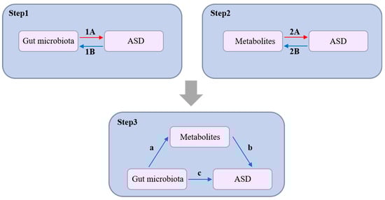Study overview. Step 1: Assessment of the causal effects of 211 gut microbiota taxa on ASD using Single Nucleotide Polymorphisms (SNPs) as instrumental variables (IVs). 1A: Represents a positive causal relationship of gut microbiota on ASD. 1B: Represents a negative causal relationship of gut microbiota on ASD. Step 2: Investigation of the impact of 1458 plasma metabolites on ASD, utilizing SNPs as IVs to identify key metabolic pathways potentially contributing to ASD pathogenesis. 2A: Represents a positive causal relationship of metabolites on ASD. 2B: Represents a negative causal relationship of metabolites on ASD. Step 3: Mediation analysis to evaluate the role of plasma metabolites as intermediaries in the association between gut microbiota and ASD, providing insights into the involvement of the gut–brain axis in ASD development. a (Path a): Represents the causal effect of gut microbiota on the mediating metabolites. b (Path b): Represents the causal effect of the mediating metabolites on ASD after controlling for the influence of gut microbiota. c (Path c): Represents the direct effect of gut microbiota on ASD (not through that specific metabolite).