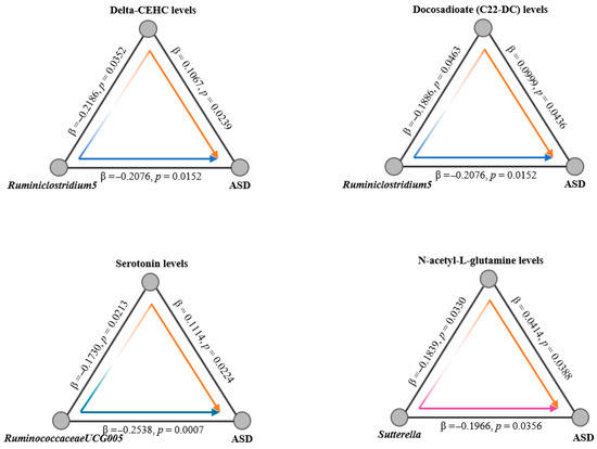 Metabolites are often regarded as passive intermediates, subject to regulation by disease states, environmental factors, and other external stimuli; however, gut microbiota actively modulate metabolite levels, which in turn mediate the effects of the microbiota on ASD and other neurological disorders, underscoring the importance of understanding the causal relationships within the gut microbiota-plasma metabolite-ASD axis. Previous studies indicated that RuminococcaceaeUCG-005 may influence neurotransmitter synthesis through the production of short-chain fatty acids (SCFAs), while Dorea has been implicated in modulating serotonin and dopamine levels within the gut–brain axis [44]. To elucidate the causal relationships among gut microbiota, plasma metabolites, and ASD, we conducted mediation Mendelian Randomization (MR) analysis, which demonstrated that gut microbiota affect ASD risk by altering plasma metabolite levels. Specifically, Ruminiclostridium5 was linked to changes in Delta-CEHC and Docosadioate (C22-DC), RuminococcaceaeUCG-005 was associated with serotonin regulation, and Sutterella influenced the levels of N-acetyl-L-glutamine. The involvement of vitamin E, lipid metabolism, and neurotransmitters indicates that the regulation of ASD by gut microbiota likely occurs through multiple pathways. This Mendelian randomization study provides strong causal evidence for the gut microbiota–plasma metabolite–ASD axis, emphasizing its critical role in ASD pathogenesis. From a clinical-translational perspective, the specific microbial taxa and plasma metabolites identified—such as RuminococcaceaeUCG-005 linked to C22-DC and serotonin and Sutterella associated with N-acetyl-L-glutamine—form a promising biomarker panel. This panel could enable early auxiliary diagnosis and subtype stratification for ASD, while the elucidated causal pathways highlight actionable targets for microbial intervention, laying a scientific foundation for future therapies involving probiotics, prebiotics, or dietary supplements.