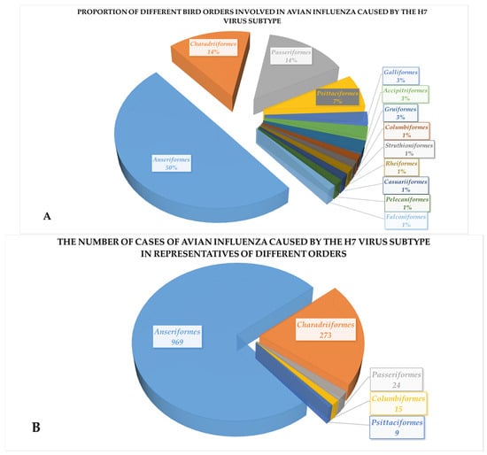 Biodiversity of wild birds involved in AIV H7 pandemics in 1902–2025: (A) Proportion of different bird orders involved in avian influenza caused by the H7 virus subtype; (B) The number of cases of avian unfluenza caused by the H7 subtype in representatives of different orders.