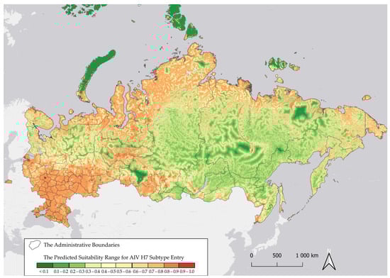 Based on environmental and climatic data, our model visualized areas within Russia at high risk for the introduction of AIV H7 (Figure 5).