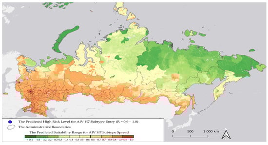 The second model visualized the highest-risk areas for AIV H7 spread within Russia (Figure 9).