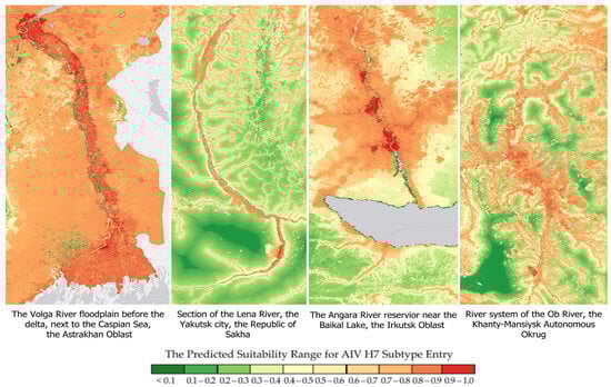 The study identified high-risk areas in the Russian Federation for the introduction of the H7 avian influenza virus by wild waterfowl and aquatic birds. Russia’s extensive water areas serve as vital stopover sites, refueling points, and wintering grounds for migrating birds. These are the Caspian Sea; the Black Sea; Lake Baikal; the basins of the Volga, Ob, Lena, Amur rivers. Birds use these areas not only as final destinations but also as stopover sites, as their migration flows are oriented toward nesting in more northern territories []. The results of the study by Zhang J.L. et al. [], 2022, demonstrated that the accumulation of waterfowl in wintering areas correlates with AIV H7 spread, with migration being a key factor. Air sampled from wetlands with high concentrations of key bird species contained more H7 influenza virus particles than other areas [].