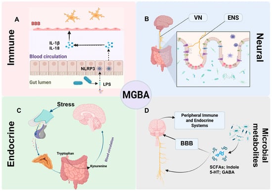 Overview of bidirectional MGBA modules and their crosstalk. Flow Explanation: This schematic illustrates the four principal communication routes constituting the MGBA and their reciprocal interactions. (A) Immune module: Gut dysbiosis or external stimuli allow LPS to activate NLRP3 inflammasomes, promoting IL-1β/IL-18 release and BBB disruption, linking peripheral inflammation to neuroinflammation. (B) Neural module: The VN and ENS transmit microbial, hormonal, and immune signals from the gut to the brain, providing a rapid neural conduit for bidirectional regulation. (C) Endocrine module: Stress activates the HPA axis, altering tryptophan metabolism toward the kynurenine pathway, thereby influencing neuroimmune signaling. (D) Microbial metabolite module: Microbial products act through endocrine and immune routes or interact with the BBB to modulate neural and systemic homeostasis. Together, these interconnected pathways form a dynamic network through which gut microbes influence brain function and behavior, and vice versa. Abbreviations: MGBA, microbiota–gut–brain axis; BBB, blood–brain barrier; IL-1β, interleukin-1 beta; IL-18, interleukin-18; NLRP3, NLR family pyrin domain-containing 3 (inflammasome); LPS, lipopolysaccharide; VN, vagus nerve; ENS, enteric nervous system; SCFAs, short-chain fatty acids; 5-HT, 5-hydroxytryptamine (serotonin); GABA, γ-aminobutyric acid.