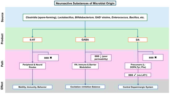 Neuroactive substances of microbial origin: sources, routes, and CNS reachability. Flow Explanation: The figure outlines the stepwise flow of microbial–neural interaction from origin to functional outcome. Specific gut bacterial taxa (Clostridia, Lactobacillus, Bifidobacterium, Enterococcus, Bacillus) generate neuroactive products such as 5-HT, GABA, and DA. These compounds differ in their permeability across the BBB and thus utilize distinct communication routes. 5-HT primarily acts through peripheral and vagal neural pathways to regulate motility and behavior, as it cannot cross the BBB. GABA has poor BBB permeability and therefore exerts its effects indirectly—through vagus nerve signaling, immune modulation, and barrier interactions—rather than direct diffusion into the brain. DA precursors (L-DOPA, Tyr, Phe) can traverse the BBB through LAT1, integrating into the central dopaminergic system. Collectively, these pathways illustrate how microbial metabolites—through neural, immune, and metabolic conduits—contribute to the MGBA implicated in ASD pathophysiology. Abbreviations: 5-HT, 5-hydroxytryptamine (serotonin); GABA, γ-aminobutyric acid; DA, dopamine; BBB, blood–brain barrier; CNS, central nervous system; VN, vagus nerve; L-DOPA, L-3,4-dihydroxyphenylalanine; Tyr, tyrosine; Phe, phenylalanine; LAT1, L-type amino acid transporter 1; GAD+, glutamate decarboxylase–positive (GABA-producing) strains. Symbols: “×”, cannot cross the BBB; “↓”, low BBB permeability; “√”, BBB-permeant (via LAT1 where indicated).