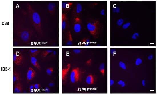 Localization of S1PR1 and its mutant form in C38 and IB3-1 cell lines. Representative images display immunofluorescence staining with anti-S1PR1 antibody (in red) in C38 S1PR1wt/wt (A), C38 S1PR1mut/mut (B), IB3-1 S1PR1wt/wt (D), and IB3-1 S1PR1mut/mut (E). The nucleus was stained with 4,6-Diamidino-2-phenylindole dihydrochloride (DAPI) (in blue) (A–F). Different localizations were analyzed using confocal microscopy (Perkin Elmer, Waltham, MA, USA). Negative control cells were stained by omitting the primary S1PR1 antibody (C,F). Scale bar: 10 µm.