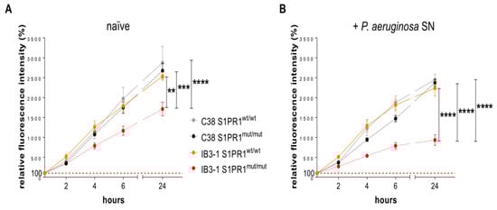 Cell viability in IB3-1 and C38 cell lines, both S1PR1mut/mut and S1PR1wt/wt. A time-course analysis of cell viability (2, 4, 6 and 24 h) was performed using the Alamar Blue assay in naïve IB3-1 S1PR1mut/mut, C38 S1PR1mut/mut, IB3-1 S1PR1wt/wt and C38 S1PR1wt/wt (A). Cells have been stimulated with exoproducts from P. aeruginosa AA2 strain supernatant (SN) (B). Data, from four independent experiments, are expressed as means ± standard errors of the means (SEM). The red dashed lines indicate the 100%, corresponding to the fluorescence of naïve cells at 20 min. ** p < 0.01, *** p < 0.001, **** p < 0.0001, according with the two-way ANOVA test with the Bonferroni correction for multiple comparisons.