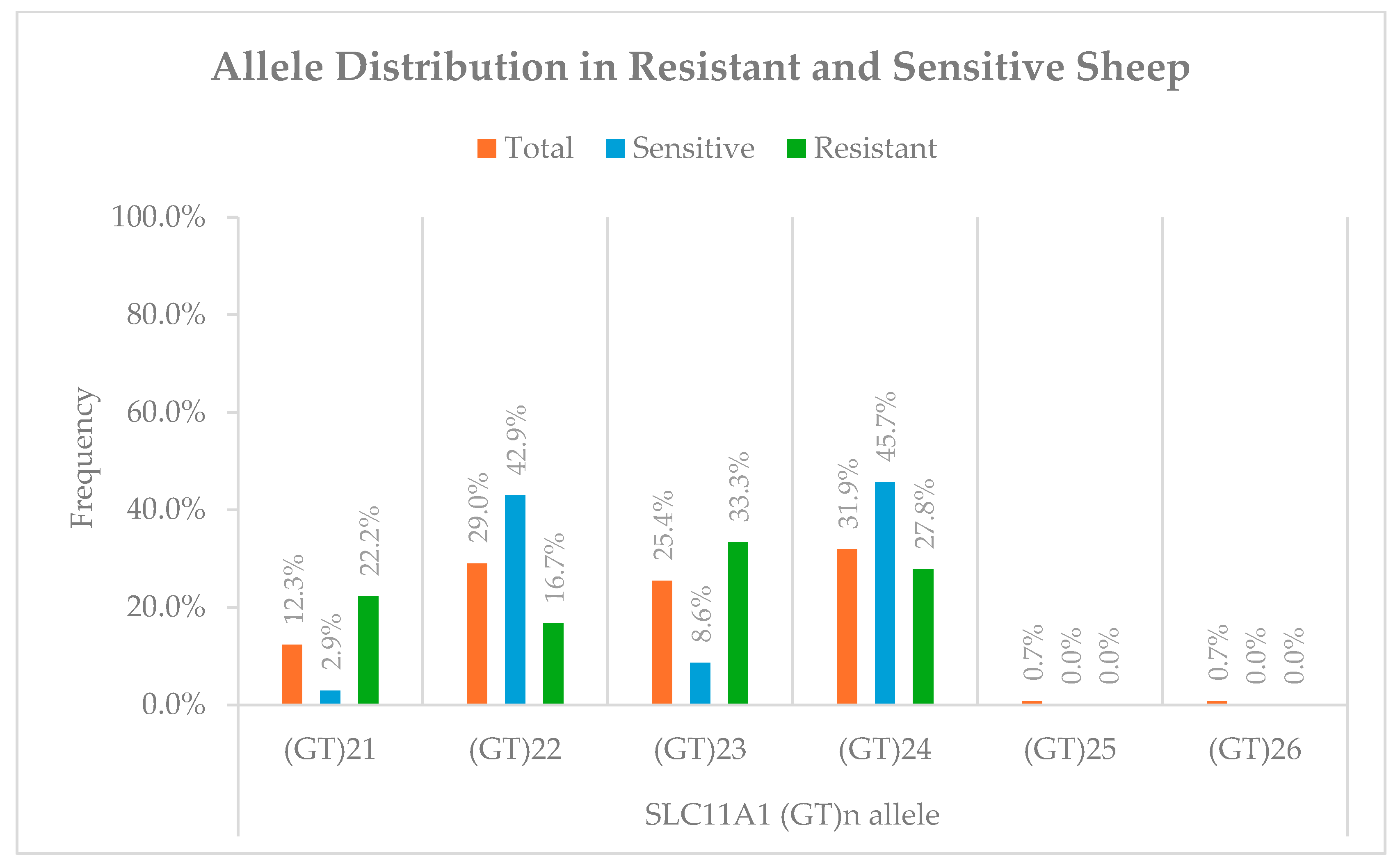 Therefore, the objective of this study was to investigate the association between allelic variation in the SLC11A1 3′UTR (GT)n microsatellite and susceptibility or resistance to paratuberculosis in sheep. By characterizing the allele distribution, gene expression profiles, and their relationship to phenotypic resistance, this study provides the first allele-level evidence for a potential functional role of SLC11A1 regulatory polymorphisms in ovine paratuberculosis.