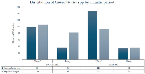 The association between the climate season of the samples taken and the detection of Campylobacter spp. in the 633 samples of processed raw milk was evaluated. Samples collected during the warm season had a higher percentage of positivity (n = 246) compared to those obtained in the rainy season (n = 70) (Figure 1). Statistical analysis showed a significant difference between the two periods (p-value < 0.001), and the probability of finding Campylobacter spp. in raw milk samples was approximately double during the warm season compared to the rainy season (Supplementary Material).