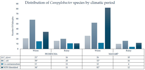 The distribution of Campylobacter species showed significant differences between the climate seasons. During warm conditions, C. jejuni had a prevalence of 14.9% (47/316), while on rainy seasons it was 8.2% (26/316). C. coli was the predominant species in both seasons, with a prevalence of 34.8% (110/316) in warm conditions and 11.4% (36/316) in rainy conditions. Co-contamination reached 8.5% (27/316) during the warm period and 6.6% (21/316) during the rainy period. Non-identified species showed the greatest difference between seasons, with a prevalence of 36.7% (116/316) in warm conditions compared to 7.3% (23/316) in rainy conditions. Statistical analysis using chi-square showed that these variations between periods were significant (p = 0.0065), indicating that the climatic period influenced the proportion of Campylobacter species detected in raw milk (Figure 2). During warm conditions, most isolates came from Manabí, with C. coli being more recurrent in this province (65.1%) than in Pichincha (34.9%); similar with C. jejuni, being positive in 59.6% of cases in Manabí. Non-identified strains showed the greatest difference, with 70.6% concentrated in Manabí and only 29.3% in Pichincha, evidencing a higher load and diversity of Campylobacter in the coastal region.