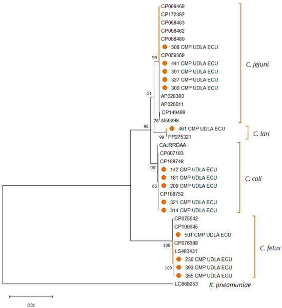 Phylogenetic tree illustrating the relationships among Campylobacter spp. sequences obtained in this study and reference sequences retrieved from NCBI, based on partial 16S rDNA gene alignment. Multiple sequence alignment was performed with ClustalX 2.1, and tree construction was carried out using MEGA X. Bootstrap values (1000 replicates) are indicated at branch nodes, and the scale bar denotes the number of substitutions per site. A Klebsiella pneumoniae 16S rDNA sequence was included as an outgroup. Sequences generated in this work are highlighted in orange (●).