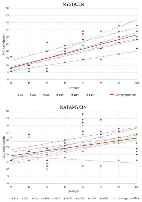 Trend lines of MIC value changes for nystatin and natamycin in individual M. pachydermatis strains (only those that survived until the end of the experiment) over 105 weekly passages on antifungal-supplemented media (4 μg/mL for nystatin and 8 μg/mL for natamycin).