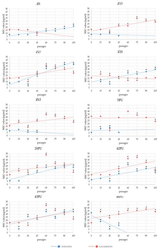 Trend lines of MIC value changes for nystatin and natamycin in Malassezia pachydermatis strains across successive passages during experimental modification of antibiotic sensitivity. Statistically significant differences compared to the initial state of * nystatin and # natamycin, p < 0.05, ANOVA, post hoc Tukey’s HSD test.