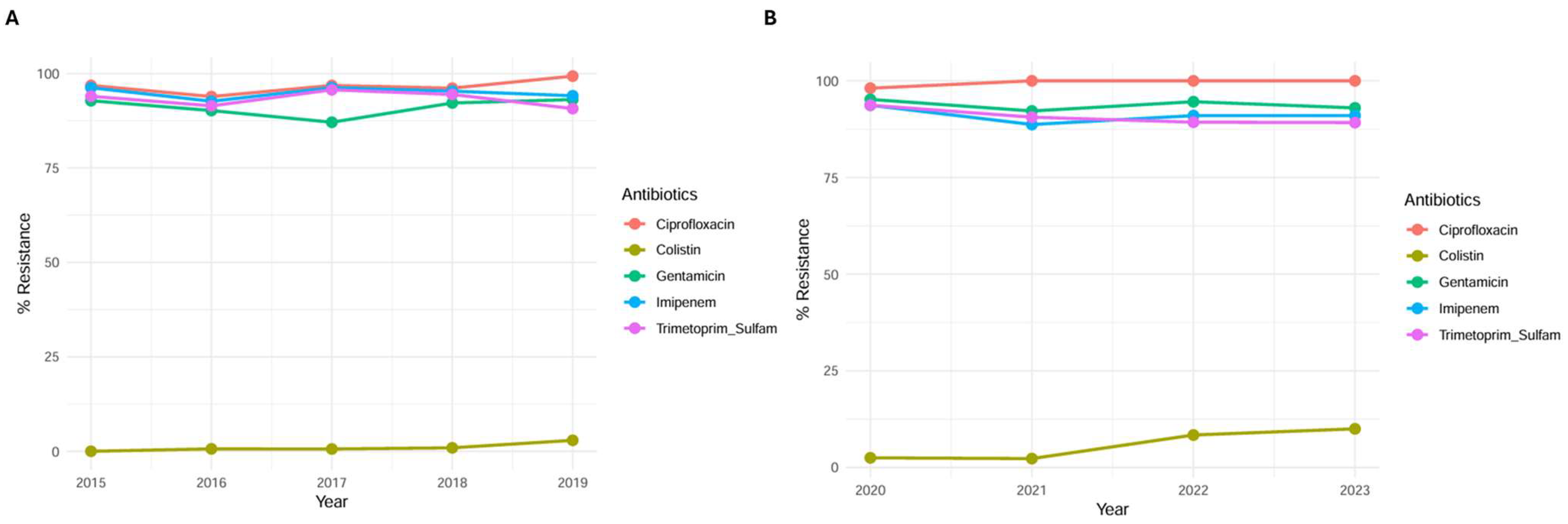 3.5. Antimicrobial Resistance Profile of A. baumannii and Its Temporal Trends