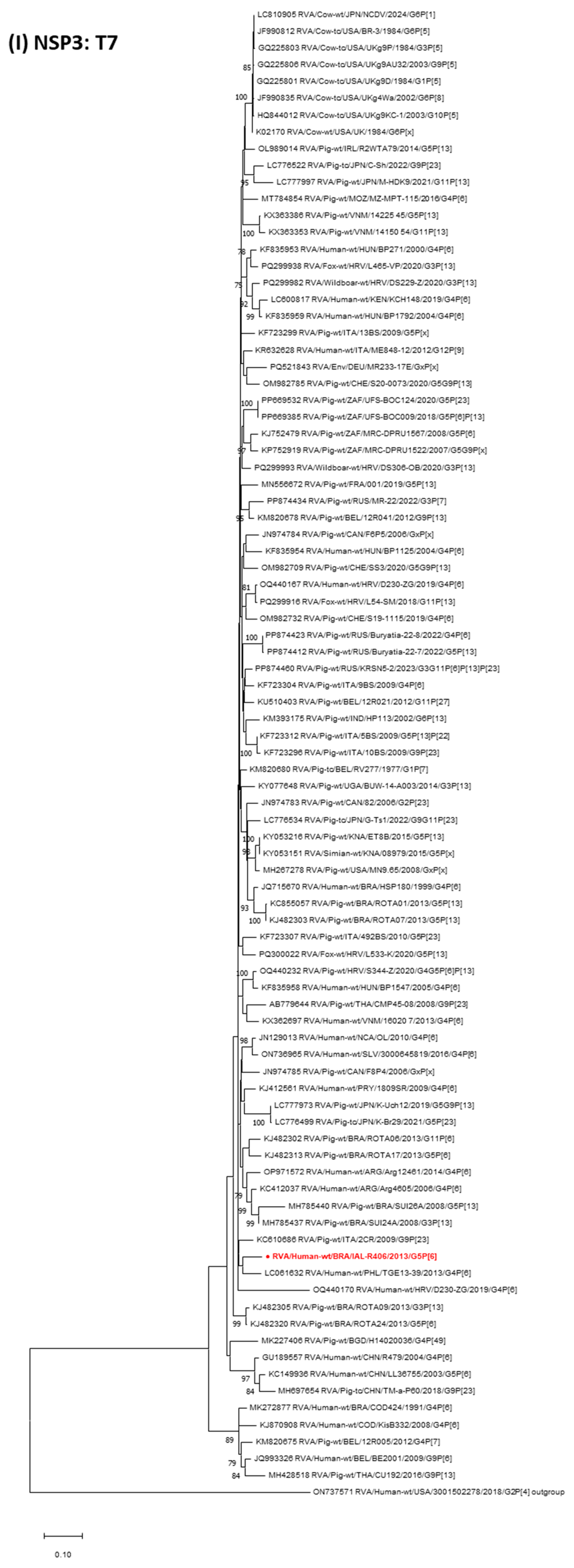 The strain RVA/Human-wt/BRA/IAL-R406/2013/G5P[6] belongs to the rare NSP3 T7 genotype (892 bp) and exhibited the closest genetic relationship with a variety of animal-like human strains, such as ITA/ME848-12/2012/G12P[9], HRV/D230-ZG/2019/G4P[6], PHL/TGE13-39/2013/G4P[6], KEN/KCH148/2019/G4P[6], PRY/1809SR/2009/G4P[6], HUN/BP271/2000/G4P[6], NCA/OL/2010/G4P[6], SLV/3000645819/2016/G4P[6], HUN/BP1125/2004/G4P[6] and ARG/Arg4605/2006/G4P[6], with nucleotide identities ranging from 91.1% to 92.8%. Comparable identities (91.1–92.2% nt) were observed with domestic animals strains, mainly pigs, from Russia (KRSN5-2/2023/G3G11P[6]P[13]P[23]), Canada (F8P4/2006/GxP[x]), South Africa (UFS-BOC124/2020/G5P[23], MRC-DPRU1567/2008/G5P[6], UFS-BOC009/2018/G5P[6]P[13]), Japan (C-Sh/2022/G9P[23]), India (HP113/2002/G6P[13]), Italy (2CR/2009/G9P[23], 13BS/2009/G5P[x], 9BS/2009/G4P[6], 5BS/2009/G5P[13]P[22]), Ireland (R2WTA79/2014/G5P[13]), Switzerland (S20-0073/2020/G5G9P[13], S19-1115/2019/G4P[6]) and Belgium (RV277/1977/G1P[7]). The strain also showed similarity with the USA bovine strain UK/1984/G6P[x] (91.3% nt) and with wild animal strains from Croatia, including wild boars (DS306-OB/2020/G3P[13], DS229-Z/2020/G3P[13]; 91.7–92.1% nt) and foxes (L465-VP/2020/G3P[13], L54-SM/2018/G11P[13]; 91.3–91.7% nt) (Figure 1H).