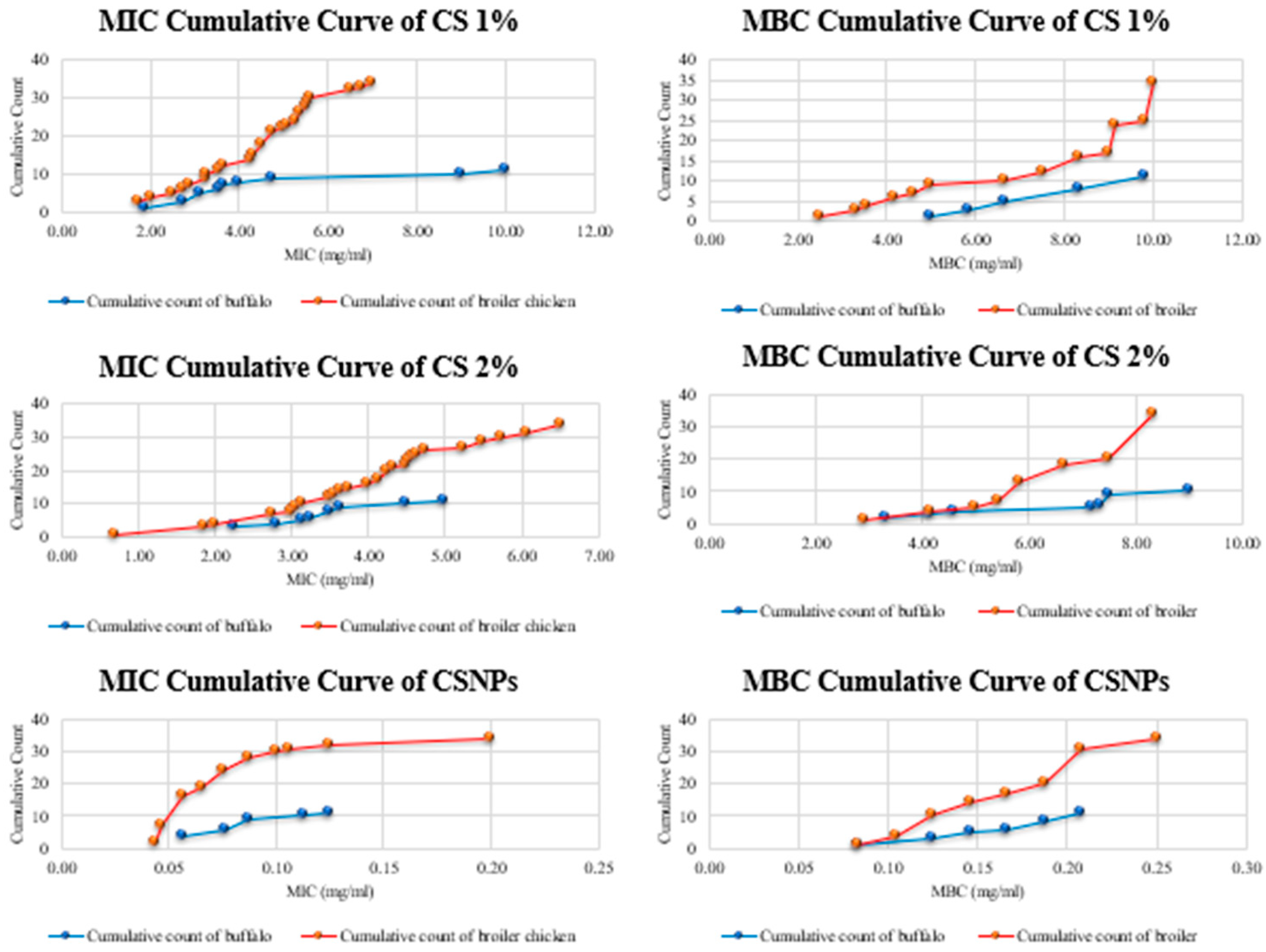 | MIC of broiler chicken | CS 1% | 1.75 | 3.25 | 4.5 | 5.38 | 6.5 | 2.13 | 7 |