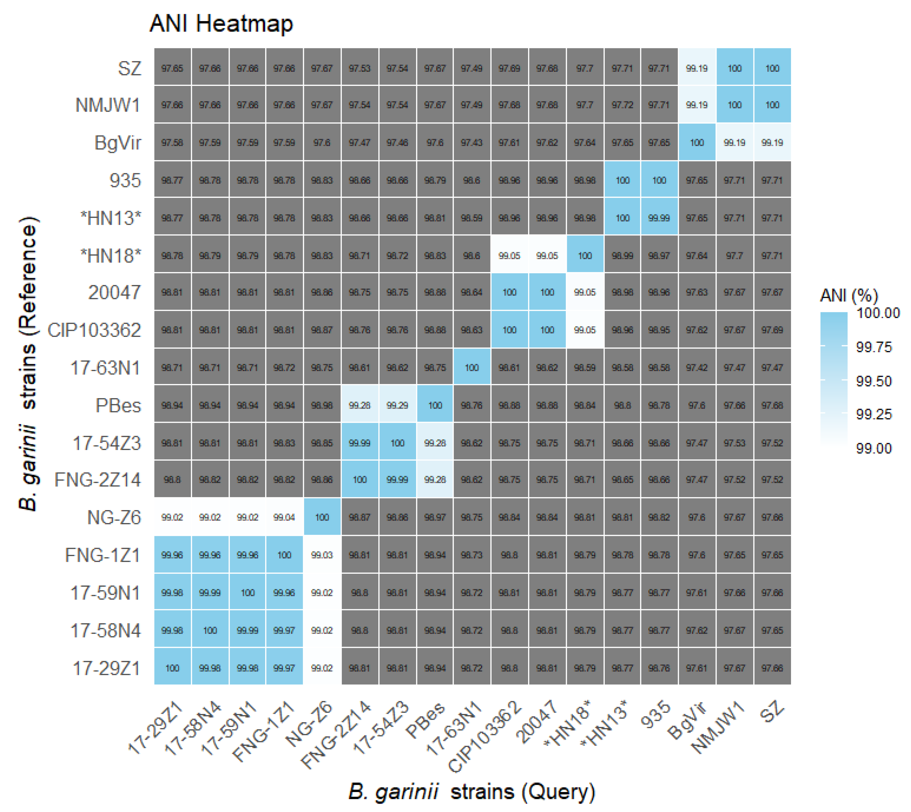 Figure 2. Average nucleotide identity (ANI) heatmap of 17 B. garinii chromosome sequences, including B. garinii strains HN13 and HN18 isolated in this study. The color scale indicates ANI values among the genomes, with gray shading representing ANI values below 99%. Novel strains HN13 and HN18 are highlighted with *.
